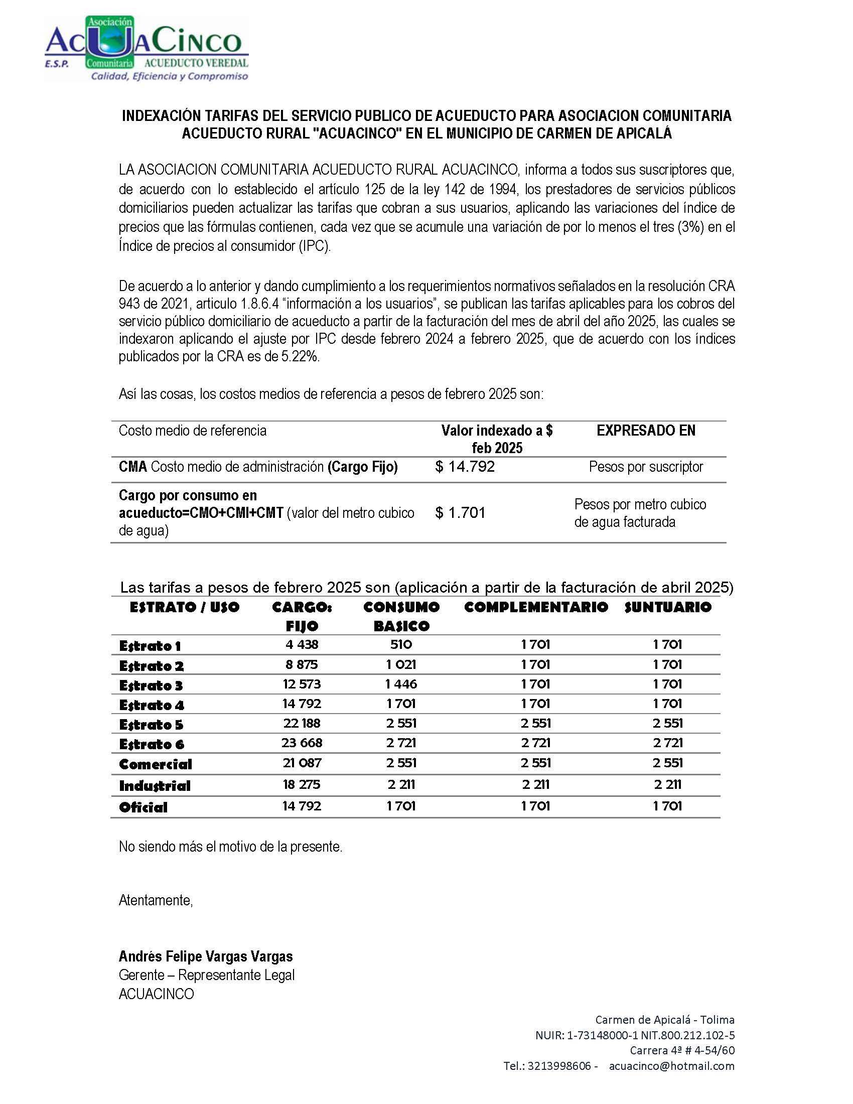 La Asociación Comunitaria Acueducto Rural ACUACINCO, fiel a su compromiso con la transparencia, la sostenibilidad y el bienestar de nuestras comunidades rurales, informa a todos sus suscriptores que, a partir de Julio de 2025, se implementarán nuevas tarifas para el servicio de acueducto, conforme a la Resolución CRA 864 de 2018 y demás normas complementarias.
